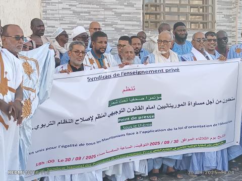 عقدت نقابات التعليم الخاص مساء اليوم في مقرها بمقاطعة تفرغ زينة بولاية نواكشوط الغربية مؤتمرًا صحفيًا، خصصته لتسليط الضوء على ما وصفته بـ"الخروقات الجسيمة" التي ارتكبتها وزارة التربية الوطنية وإصلاح نظام التعليم، معتبرة أن تلك الإجراءات تمثل مخالفة صريحة للقانون التوجيهي المنظم للقطاع.